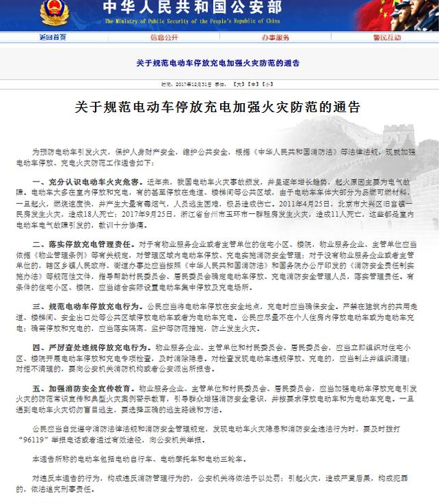 据新浪新闻2018年1月8日、11日分别报道《你的电动车停放充电规范了吗?》《个别小区电动车“借智”安全充电》,禁止在共用走道、楼梯间、安全出口处等公共区域随意停放电动车、私拉电线为电动车充电的现象,目前消防支队已在全市各小区下发通知,要求在小区内专门规划服务点,统一停放电动车;安装智能充电站,利用智能充电站充满后自动断电的优点为各小区的电动车安全充电,以此减少火灾事故发生,消除安全隐患。