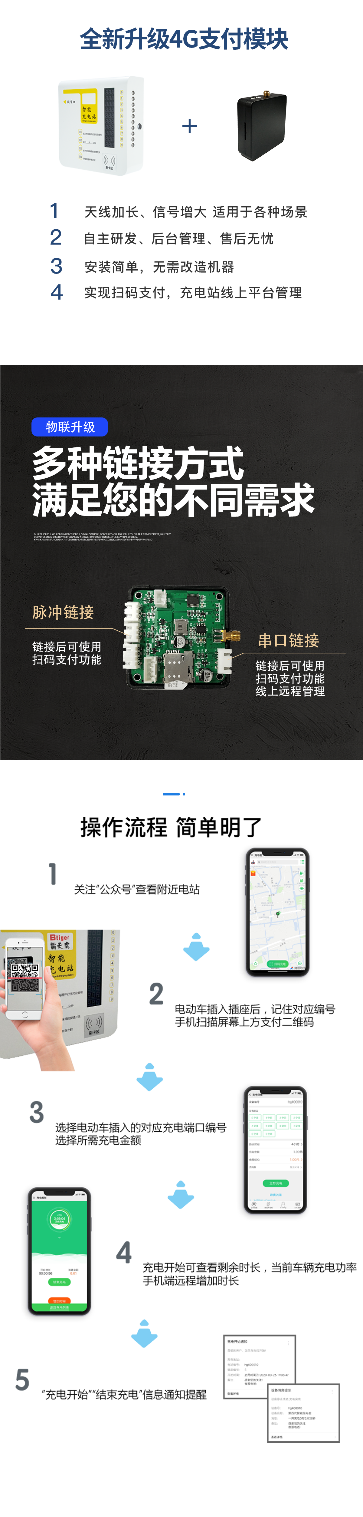 安装便捷多种连接方式 物联,单机款设备链接支付盒子后均可实现扫码支付、远程管理、实时查询账单、收益自动到账、手机远程设置充电站功率区间计费;