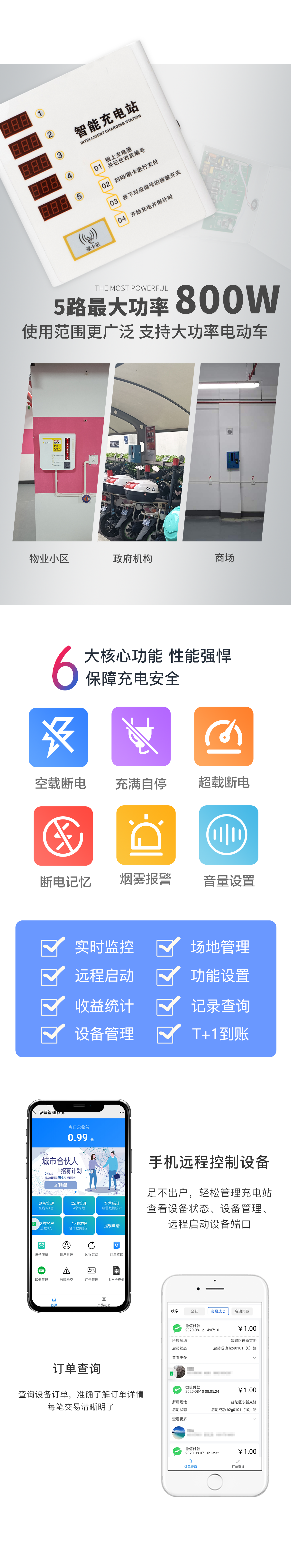 实时监测 | 远程启动 | 收益统计 | 设备管理 | 场地管理 | 功能设置 | 记录到账 | T+1到账