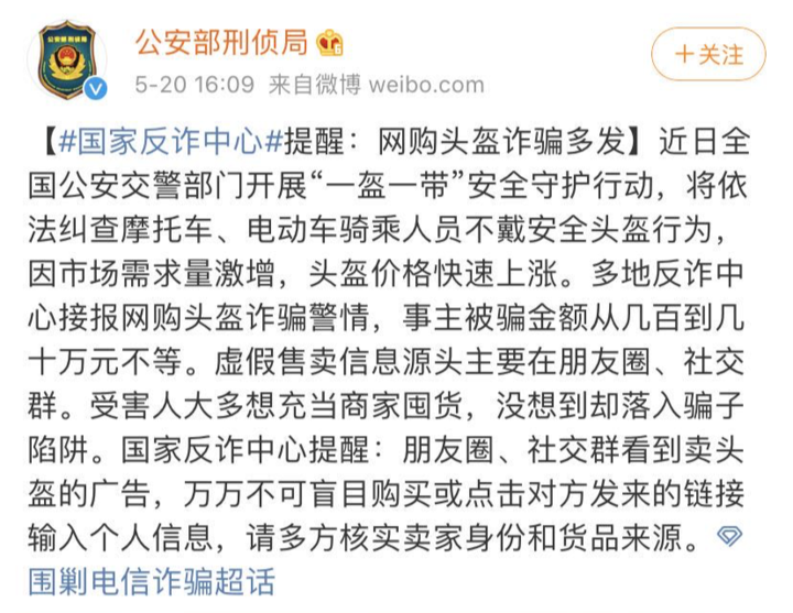 20日,国家反诈骗中心提醒,在朋友圈、社交群看到卖头盔的广告,万万不可盲目购买或者点击对方发来的链接输入个人信息,请多方核实卖家身份和货品来源,谨防被骗遭受损失。